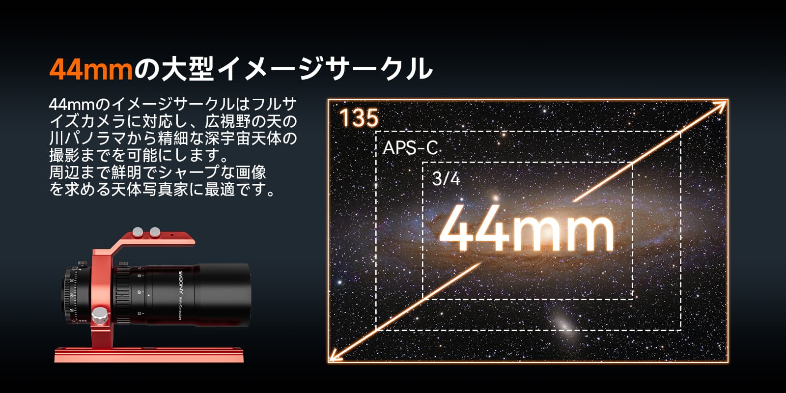 【44mmフルフレーム】APO天体写真望遠鏡は、ミラーレスカメラ、デジタル一眼レフカメラ、天文カメラのいずれであっても、絞りのブロッキングを回避でき、鮮明な画像を簡単にキャプチャできます。