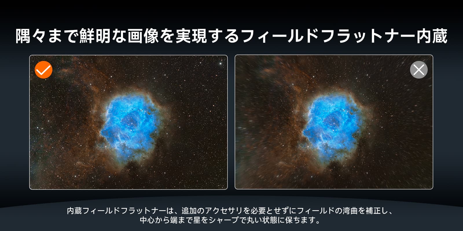 APO写真望遠鏡は、3群5枚構成のPetzval対物レンズを搭載し、より鮮明な画像を実現します。内蔵のフィールドフラットナーは、コマ収差などの収差を効果的に除去します。